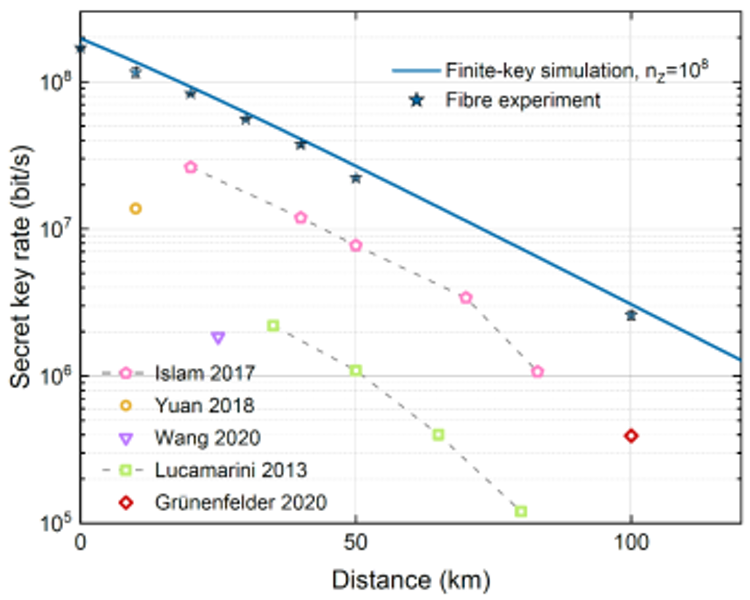 中国科学技术大学潘建伟、徐飞虎等与上海微系统所、济南量子技术研究院、哈尔滨工业大学等单位的科研人员合作,通过发展高保真度集成光子学量子态调控、高计数率超导单光子探测等关键技术,首次在国际上实现百兆比特率的实时量子密钥分发,实验结果将此前的成码率纪录提升一个数量级。该成果于3月14日在线发表于国际著名学术期刊《自然-光子学》(Nature Photonics)杂志。