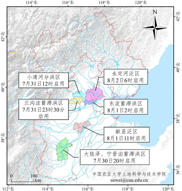 已启用的7个蓄滞洪区空间分布及启用时间图