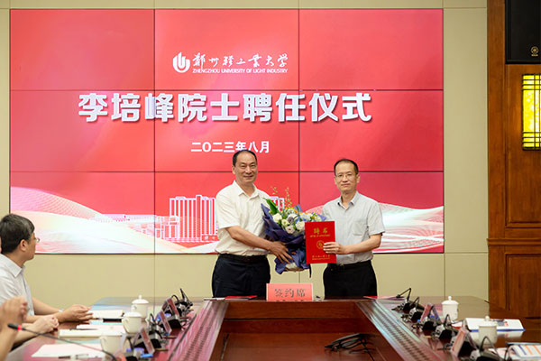 李培峰在聘任仪式上讲话。他对上级领导和学校在引进过程中给予的支持表示感谢。他表示,很高兴受聘郑州轻工业大学。近年来郑州轻工业大学在更名大学、博士授权单位、学科专业建设、科研平台、人才培养建设方面,都取得了丰硕的成果,今后将尽力为学校学科建设、国际化合作、实验室团队建设及重大科研项目研究等工作做出自己的贡献。