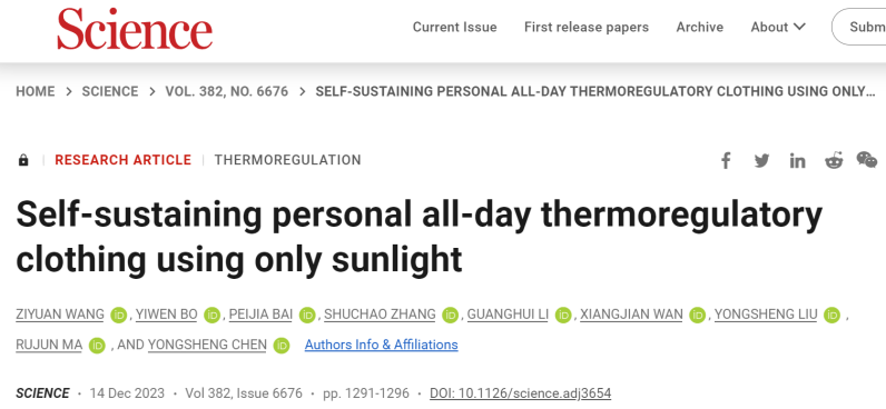 2023年12月15日,南开大学刘永胜、马儒军及陈永胜共同通讯在Science在线发表题为“仅用太阳光驱动的全天候自持续人体热管理衣物”(Self-sustaining personal all-day thermoregulatory clothing using only sunlight)的研究论文,这是南开大学不到一个月内发表的第二篇Science论文,也是化学学院陈永胜教授团队在南开大学发表的第三篇Science论文。