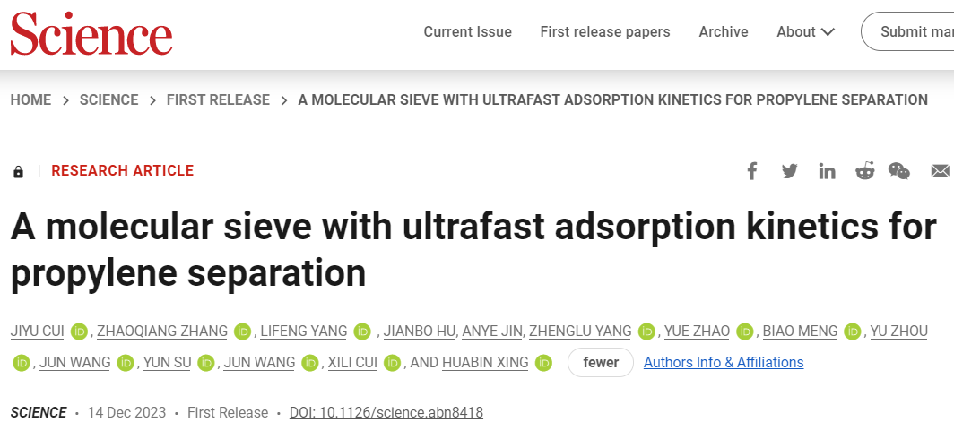 2023年12月14日,浙江大学邢华斌及杨立峰在Science 在线发表题为“A molecular sieve with ultrafast adsorption kinetics for propylene separation”的研究论文,该研究报道了一种分子筛ZU-609,它具有局部筛选通道,具有分子筛选门和快速扩散通道。