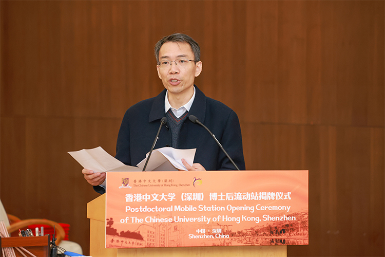 仪式伊始,李学金教授对港中大(深圳)博士后总体情况进行介绍,回顾了我校博士后流动站的申报历程,对深圳市人力资源和社会保障局为大学争取到流动站政策突破表达了衷心感谢。李教授强调:“博士后流动站是大家的共同平台,期待与社会各界的合作共赢。”