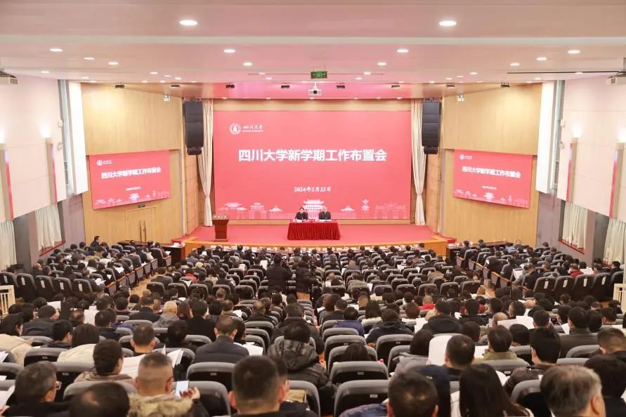 2月23日,四川大学在望江校区笃行楼举行2024年新学期工作布置会。校党委书记甘霖、校长汪劲松等全体校领导、校长助理,院士、杰出教授等专家学者代表,“两委”委员,全体中层领导干部,民主党派、统战团体主要负责人,专职科研机构主要负责人,关工委办公室负责人,各单位工会主席等参加会议。甘霖主持会议并作讲话,汪劲松对学校新学期工作作出部署。