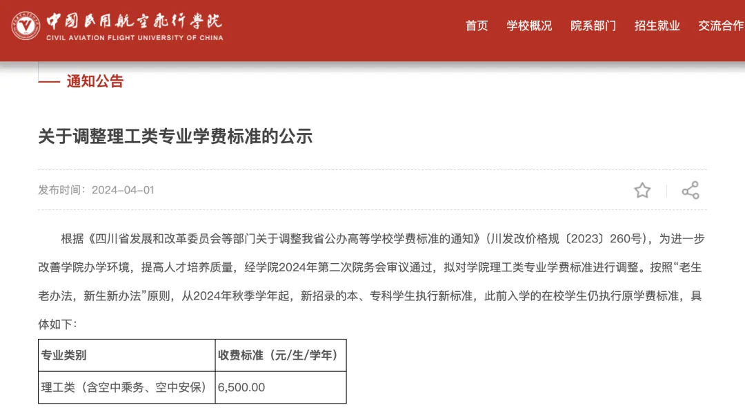 4月1日,中国民用航空飞行学院发布了《关于调整理工类专业学费标准的公示》。
