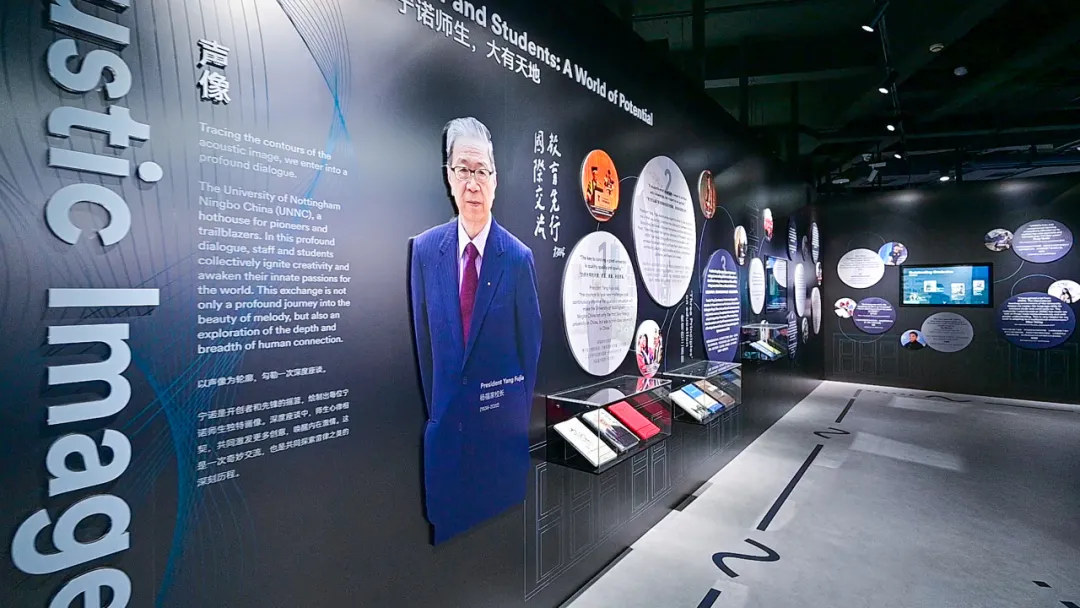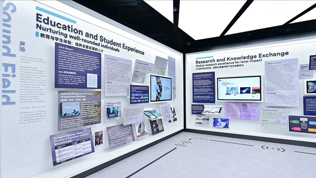 宁诺校史馆坐落于学校标志性建筑钟楼的东侧,占地约500平米。走进史馆,一幅长7米、高2米的巨幕通过 “钟声视觉化”的方式,带领观众从1881年英国诺丁汉大学钟楼敲响的第一声穿越到了百余年后的中国宁波。随后,展览围绕着这声钟响,通过“声线” “声场”“回响”“声像”和“共鸣”五大元素,将宁诺二十年之风华汇聚成一场丰富的视听盛宴。