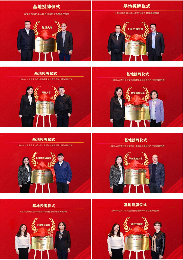 郁能文处长代表上海市教委宣读了新一轮“上海教育立法咨询与服务研究基地”入选名单,与会领导们对八家基地单位进行了授牌。