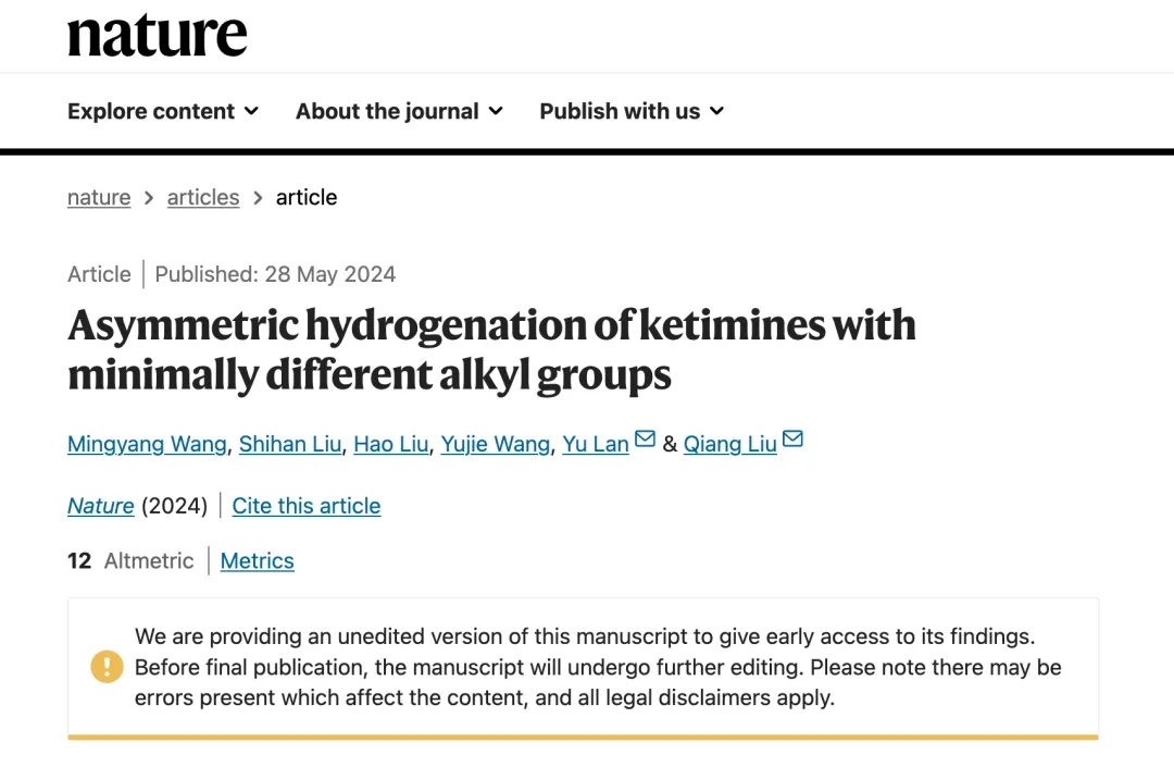 北京时间5月29日,化学系刘强课题组相关研究以《微小差异烷基取代酮亚胺化合物的不对称氢化》(Asymmetric hydrogenation of ketimines with minimally different alkyl groups)为题在线发表于《自然》(Nature)网站。