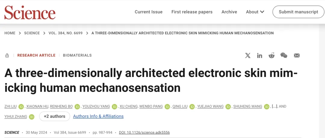北京时间5月31日,航天航空学院、柔性电子技术实验室张一慧教授课题组在《科学》(Science)杂志发表了题为《仿人类皮肤机械感知功能的三维架构电子皮肤》(A Three-Dimensionally Architected Electronic Skin Mimicking Human Mechanosensation)的研究论文。该工作被选为 Science 官网的焦点图片。