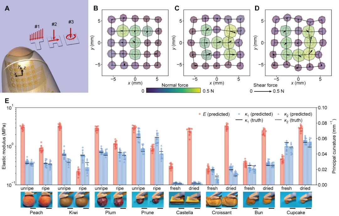 该课题组提出了一种具有三维架构的新型电子皮肤(简称“3DAE-Skin”),其结构中的力与应变传感器的三维分布效仿了人类皮肤中Merkel细胞和Ruffini小体的空间分布形式,使该器件能够从物理层面解耦地测量压力、剪切力和应变。课题组基于该器件(3DAE-Skin),结合深度学习算法,研制出只需通过触摸便可同时测量物体模量及局部主曲率的先进触觉系统,展示了其在判别食物新鲜程度等真实场景中的应用,并深入探讨了其在物理量定量测量(如摩擦系数等)、人机交互等重要领域的应用潜力。