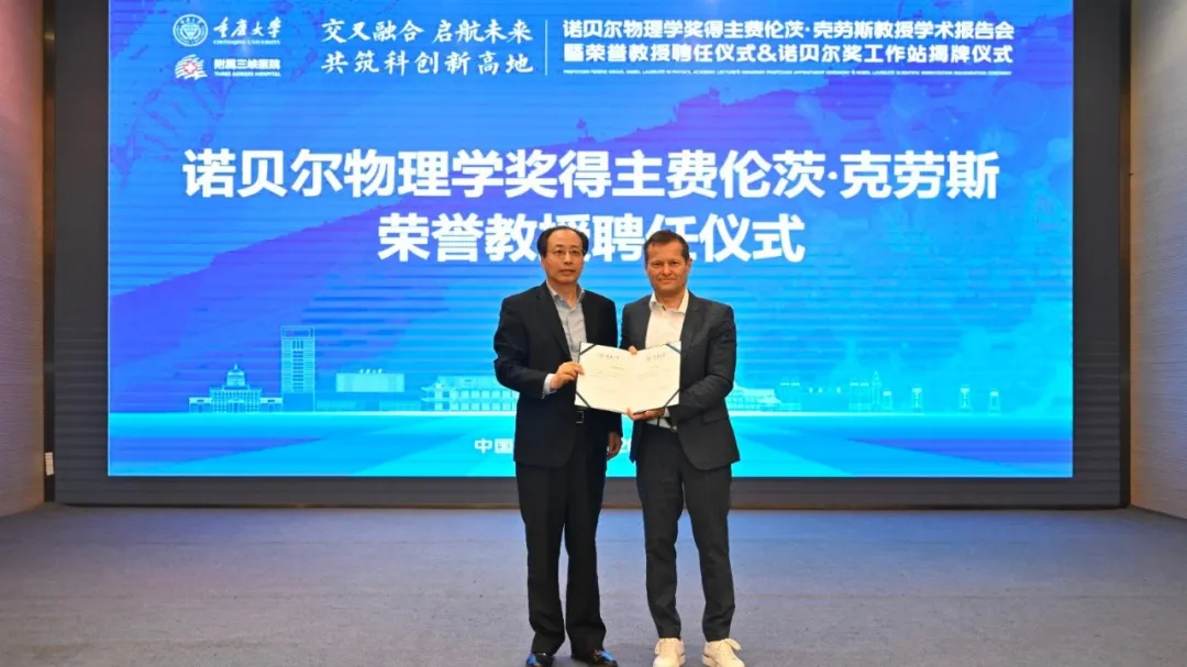 当日,费伦茨·克劳斯受聘重庆大学荣誉教授仪式暨重庆大学附属三峡医院与前沿技术交叉研究院诺贝尔奖工作站揭牌仪式在重庆大学虎溪校区图书馆报告厅举行。