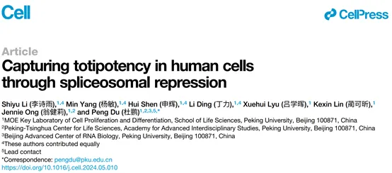 6月5日,杜鹏课题组在Cell杂志在线发表了题为“Capturing Totipotency in Human Cells Through Spliceosome Repression”的研究论文。