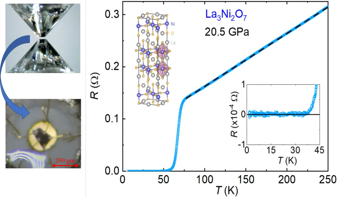 2023年5月,中山大学王猛团队等首次报道了双层镍氧化物La₃Ni₂O₇中接近80K的压致超导迹象,但零电阻的缺失使得学界对其超导电性仍存在怀疑。