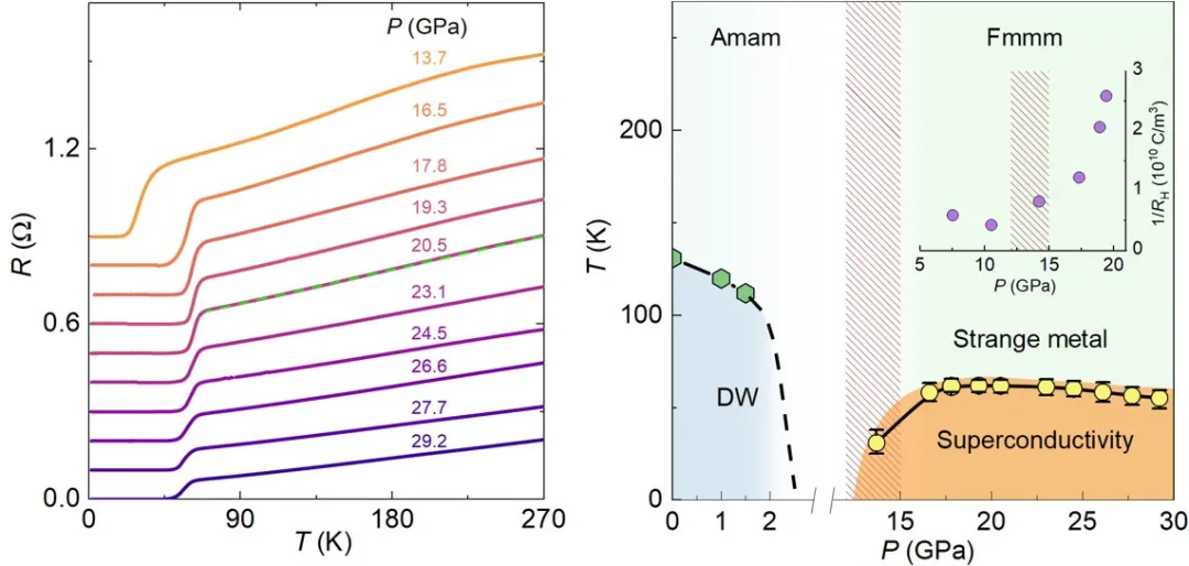 图2:不同压力下的电阻曲线(左图)以及压力-温度相图(右图)