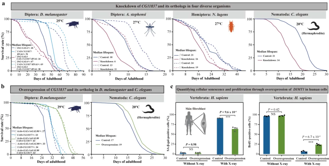 于是,研究人员首先在褐飞虱、果蝇、斯氏按蚊和秀丽隐杆线虫等六种不同的动物中进行了基因敲降实验。令人惊讶的是,实验结果显示,降低CG11837基因的活力均显著缩短了这六种动物的寿命,缩短幅度在25%至59%之间(图2a)。