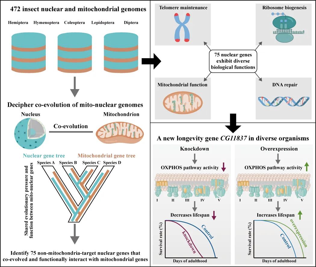 研究团队通过分析公共数据库中的数据,收集了472种昆虫的核基因组和线粒体基因组。运用共进化算法,构建了线粒体基因组—核基因组之间的共进化全局图谱(图1)。通过对这一图谱的详细分析,发现有75个核基因,尽管它们不定位于线粒体,却与线粒体基因展现出显著的共进化模式。这75个共进的核基因表现出不同的功能,包括端粒维持、核糖体生物发生、线粒体功能和DNA修复,而这些功能都与生命衰老和疾病显著相关。“我们可以将这种共进化模式理解为,有两辆汽车以相同的速度并行行驶在道路上,彼此的速度变化紧密同步,一方的加速或减速会立即反映在另一方上。”沈星星说。