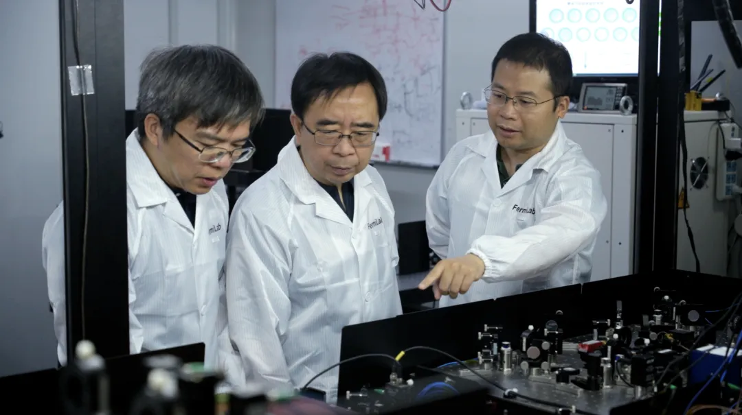 潘建伟(中)与陈宇翱(左)、姚星灿(右)在实验室讨论问题