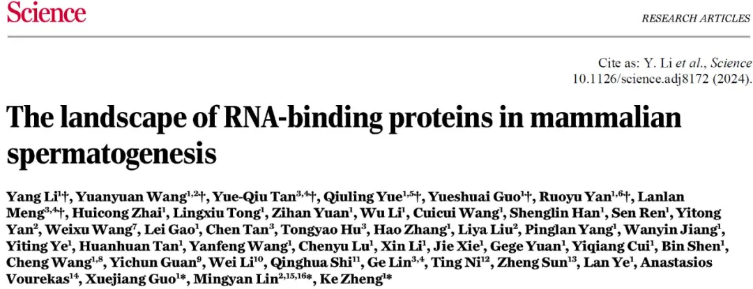 8月29日,南京医科大学生殖医学与子代健康全国重点实验室郑科教授、郭雪江教授,基础医学院神经生物学系林明焰副教授和中南大学谭跃球教授等课题组合作,在学术期刊《科学》(Science)在线发表了题为《哺乳动物精子发生RNA结合蛋白质的全景图谱》(The Landscape of RNA-Binding Proteins in Mammalian Spermatogenesis )的学术论文(Research Article)。