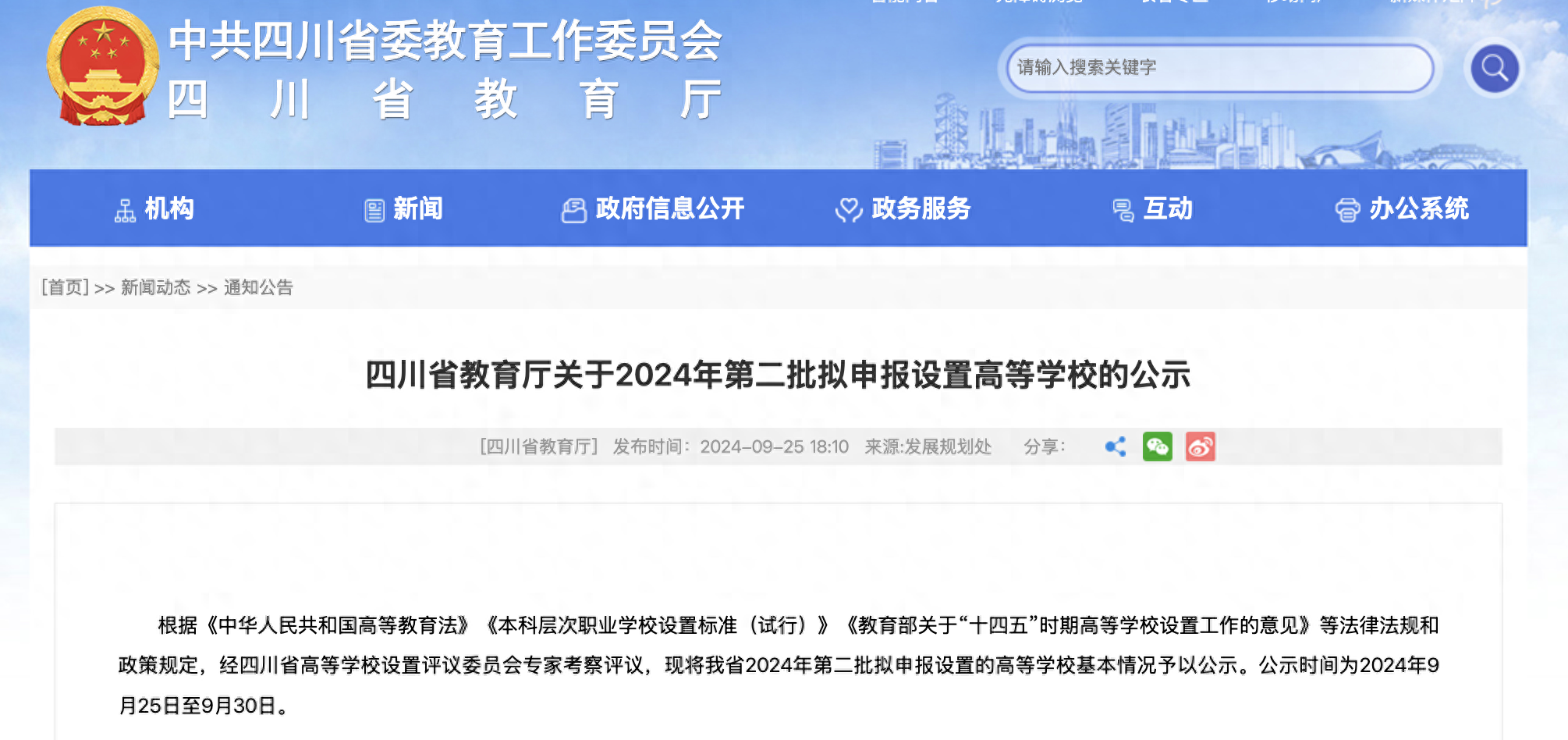 9月25日,四川省教育厅网站发布关于2024年第二批拟申报设置高等学校的公示。附件内容显示,四川省人民政府拟以成都航空职业技术学院为建校基础,申请设立成都航空职业技术大学,办学体制为公办。