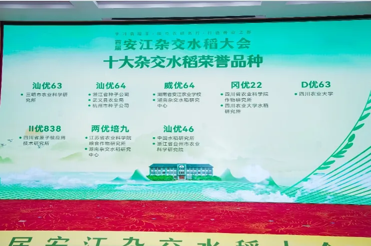 一粒良种,万担好粮。50多年来,杂交稻育种取得了一系列丰硕成果,育成了一批大面积推广的杂交稻品种,为保障粮食安全作出了突出贡献,大会依据《全国农作物主要品种推广情况统计》,对1985年至2023年累计推广面积进行分析排序,经专家组评议并于会上发布了“十大杂交水稻荣誉品种”,汕优63、汕优64、威优64、冈优22、D优63、Ⅱ优838、两优培九、汕优46、汕优6号、金优207获殊荣。十个品种中有两个为四川农业大学水稻研究所选育或参加选育,分别是D优63(四川农业大学水稻研究所选育)、冈优22(四川省农科院作物研究所与四川农业大学水稻研究所共同选育)。