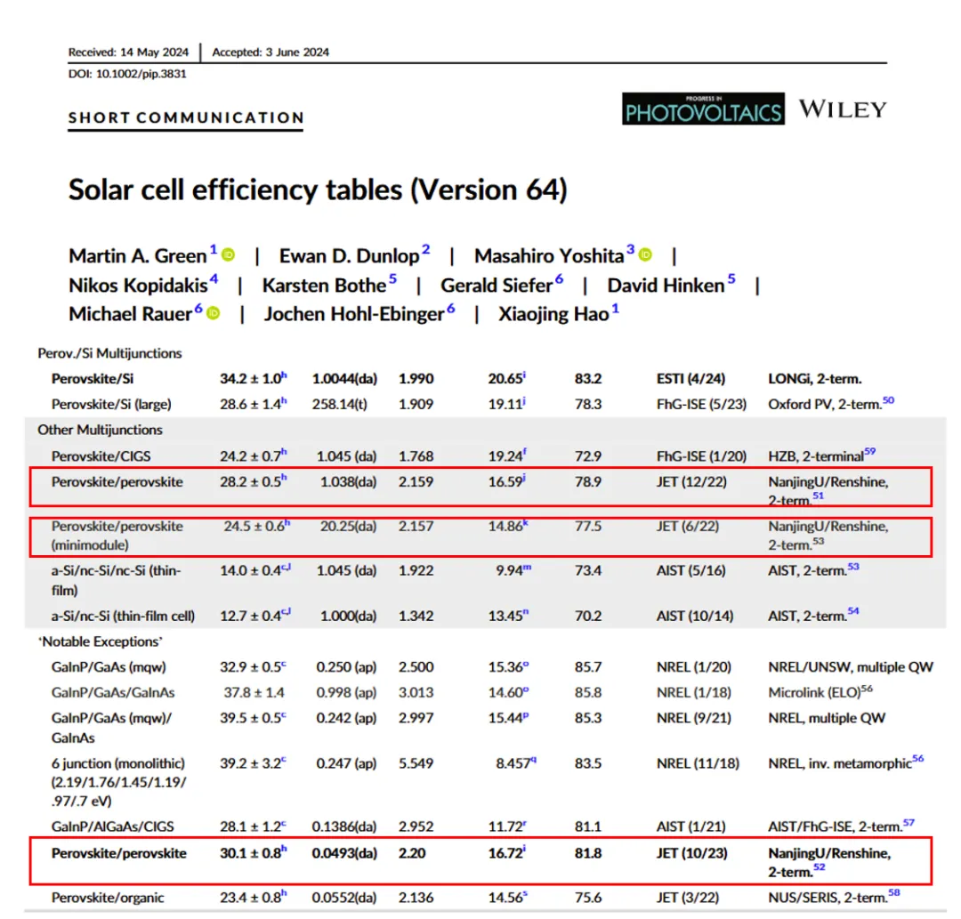 图4. 最新太阳能电池世界纪录效率表(叠层电池部分)。《Solar cell efficiency tables》是由“太阳能之父”Martin Green教授与美、日、意、澳等多国科学家联合编撰的国际权威榜单,代表了全球光伏领域的最前沿水平。