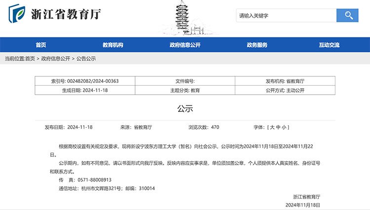 11月18日,浙江教育厅网站发布公示,将新设宁波东方理工大学(暂名),公示时间为2024年11月18日至2024年11月22日。此次公示标志着宁波东方理工大学(暂名)的建设进入新的关键阶段。