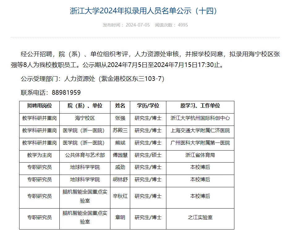 据悉,2024年7月5日,浙江大学对2024年拟录用人员名单进行公示,其中显示:傅园慧拟聘为浙江大学公共体育与艺术部的教学为主岗位。