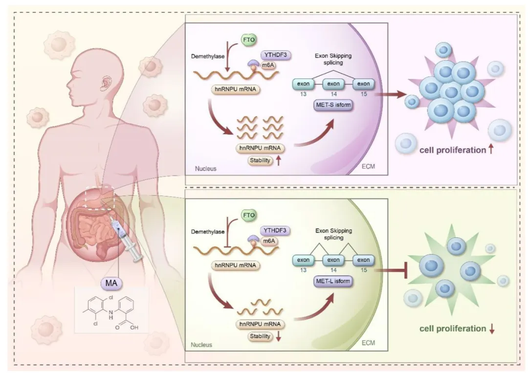 机制图:FTO通过调节HNRNPU的甲基化水平影响MET的可变剪切促进胃癌的发生
