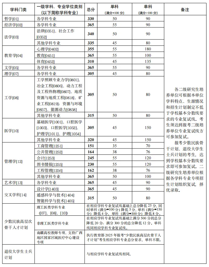 经学校研究生招生工作领导小组审议批准,现公布我校2025年全国硕士研究生招生考试考生进入复试的初试成绩基本要求: