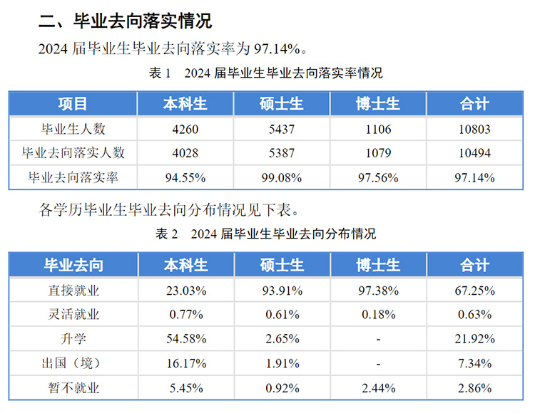 报告显示,2024届毕业生共10803人。其中,全日制毕业生8564人,非全日制毕业生2239人;本科生4260人,硕士生5437人,博士生1106人。