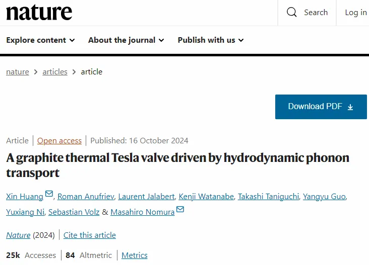 近日,国际顶级学术期刊Nature刊发西南交通大学物理科学与技术学院倪宇翔教授参与完成的科研成果“A graphite thermal Tesla valve driven by hydrodynamic phonon transport”。该成果是物理、材料等多学科的深度交叉融合,由倪宇翔教授、日本东京大学Masahiro Nomura教授团队、哈尔滨工业大学郭洋裕教授等合作完成。