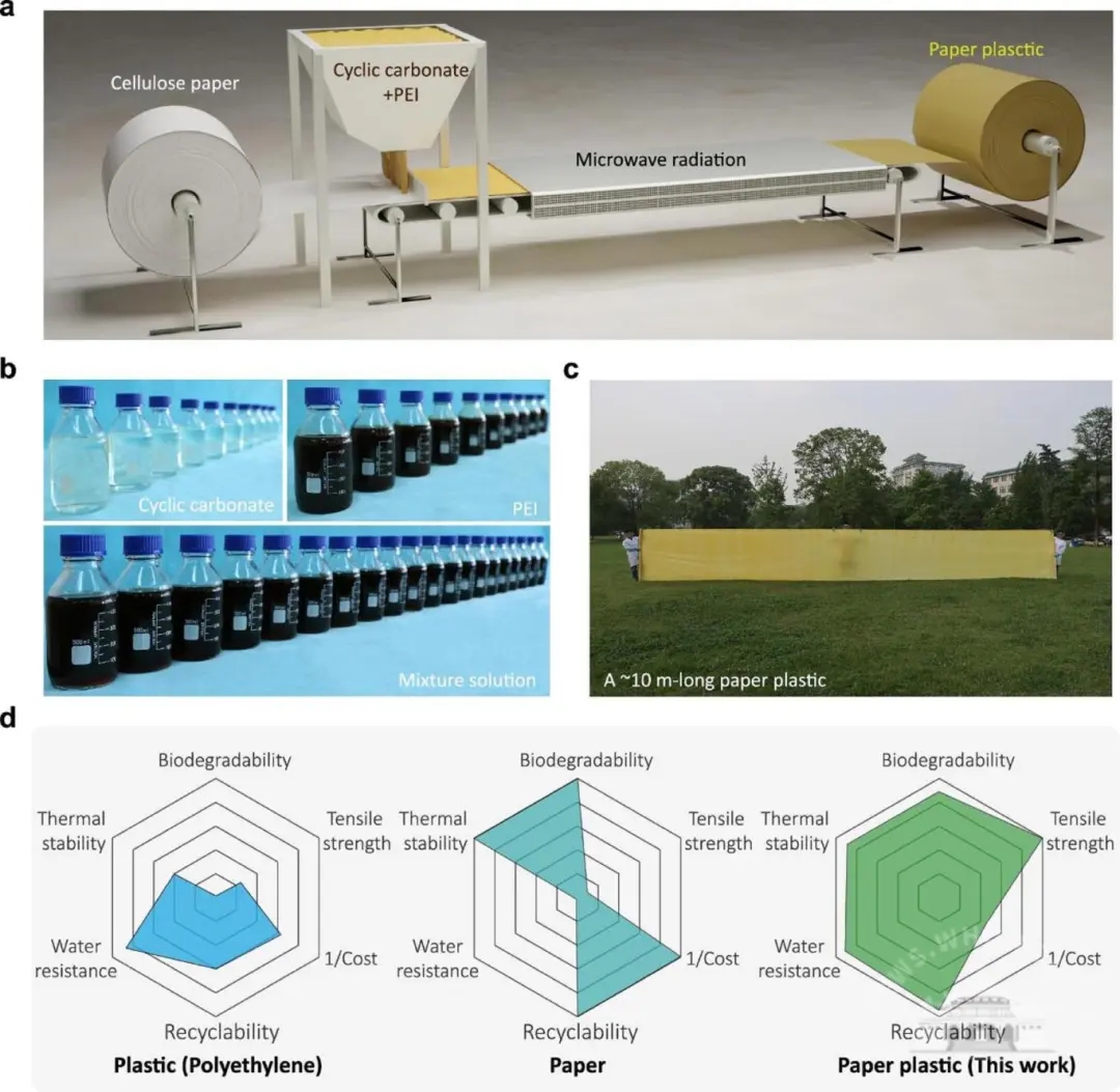 研究成果“Rapidly making biodegradable and recyclable paper plastic based on microwave radiation driven dynamic carbamate chemistry”发表于Nature Communications。研究团队通过动态氨基甲酸酯化学键与纤维素纸中羟基的相互作用,在微波辐射引发反应后快速且大规模地制备得到纸塑材料,显著提升纤维素纸基产品力学性能、耐水耐溶剂性的同时,保留材料的降解回收性与生物相容性。该项工作阐明了动态聚合物网络与纤维素纸之间的相互作用机理,进而明晰了结构对力学强度增强的机制,为“以纸代塑”的发展方向提供了切实可行的解决方案。