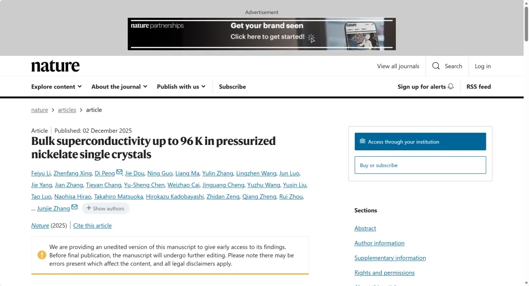 近日,山东大学晶体材料全国重点实验室张俊杰教授/陶绪堂教授团队牵头,联合北京高压研究中心曾桥石研究员、中国科学院物理研究所周睿研究员、国家纳米科学中心郑强研究员、芝加哥大学陈愈生教授等多个团队,在镍基高温超导体研究中取得重大突破,相关团队以“Bulk superconductivity up to 96 K in pressurized nickelate single crystals”为题,在线发表于国际顶级期刊《自然》(Nature)上。