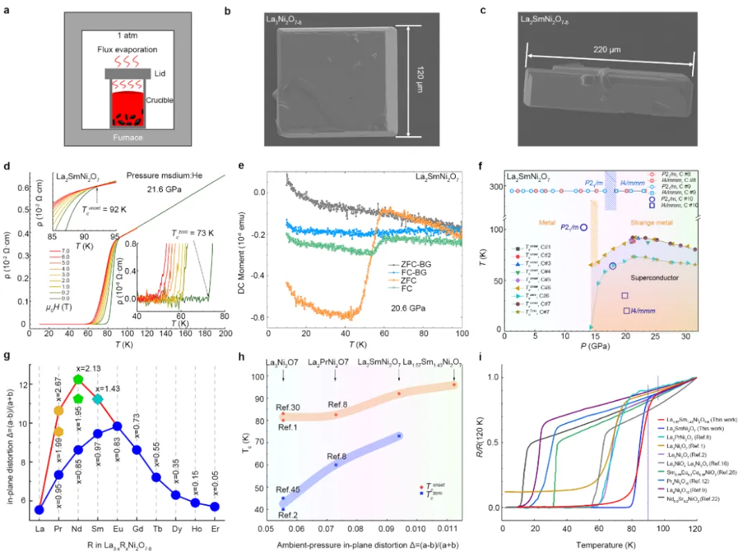 团队进一步分析结构与物性关系,首次发现关键规律:常压下面内晶格畸变Δ=(a-b)/(a+b) 与高压下最高Tc呈正相关,即晶格畸变越大,超导温度越高。基于此规律,团队测试了La1.57Sm1.43Ni2O7-δ单晶,发现其高压下Tc高达96K(约–177 ℃),创造了全球最高镍基超导温度纪录。