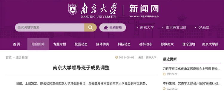南京大学官网消息:日前,上级决定,陈云松同志任南京大学党委副书记,免去薛海林同志的南京大学党委副书记职务。
