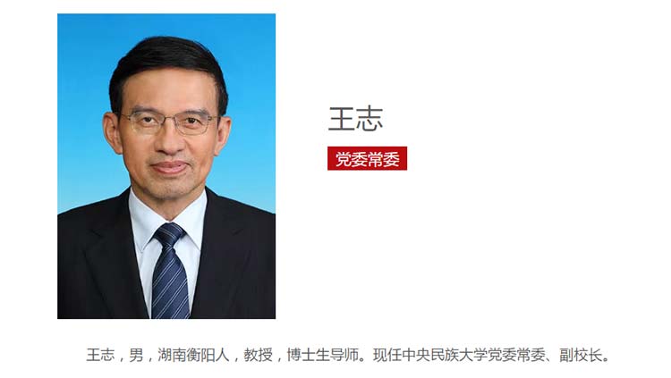 王志,1965年5月出生于湖南省衡阳市衡阳县界牌镇,教授、博士生导师。现任中央民族大学党委常委、副校长。