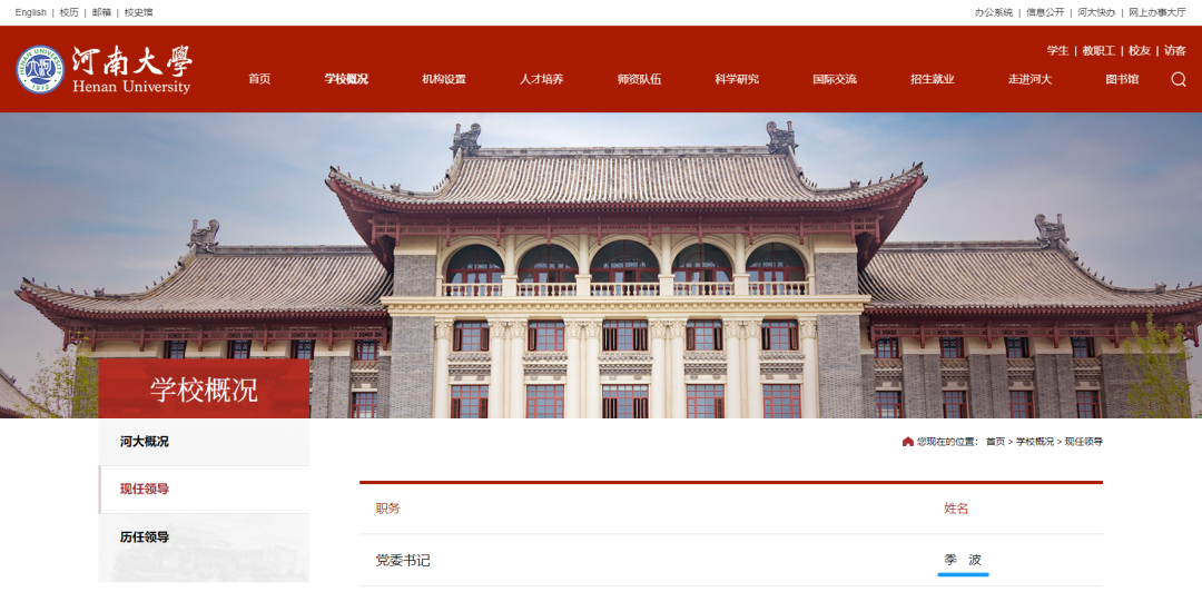日前,河南大学官网现任领导页面更新显示,季波已任河南大学党委书记。此前,卢克平已卸任河南大学党委书记职务,担任河南大学中原发展研究院院长一职。