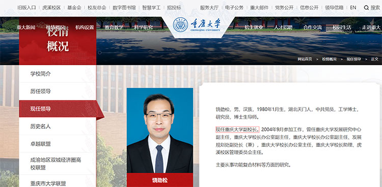 近日,重庆大学网站现任领导一栏更新显示,饶劲松已任重庆大学副校长。