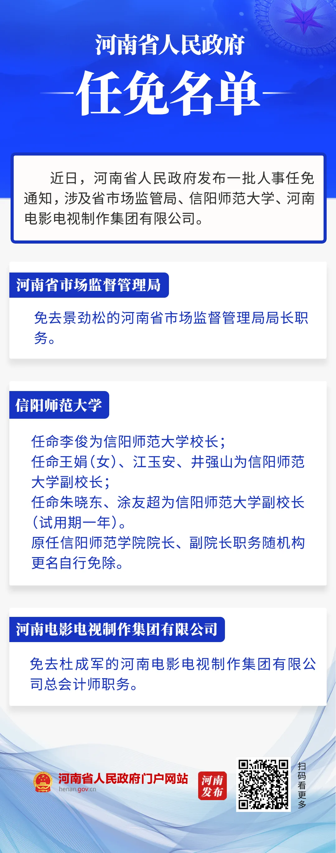 近日,河南省人民政府发布一批人事任免通知,涉及信阳师范大学领导班子调整。任命李俊任信阳师范大学党委副书记、校长;任命王娟(女)、江玉安、井强山为信阳师范大学副校长;任命朱晓东、涂友超为信阳师范大学副校长(试用期一年)。