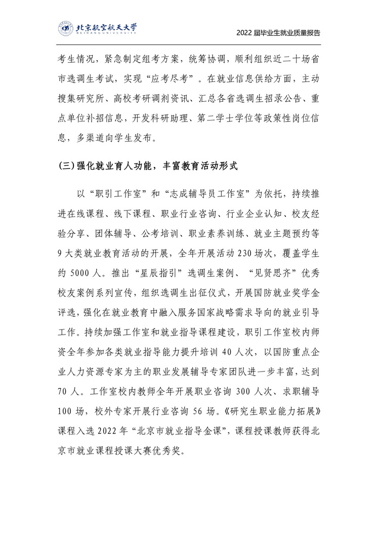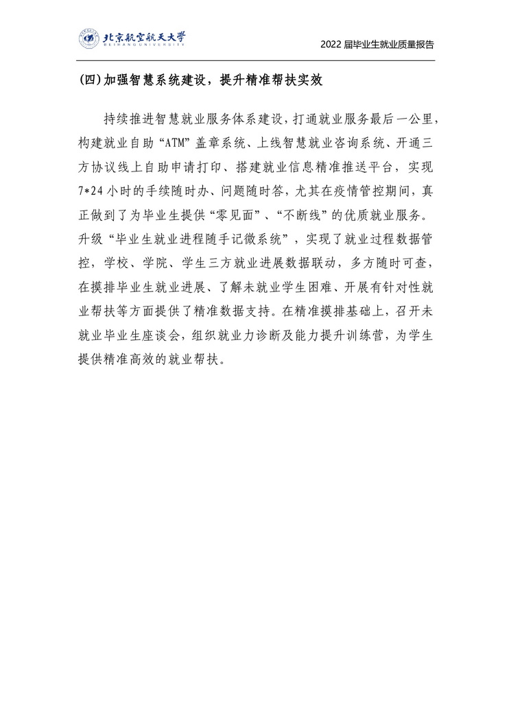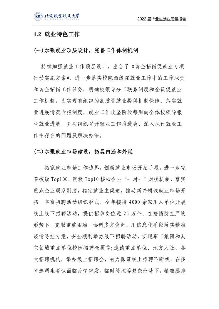 为深入学习贯彻习近平新时代中国特色社会主义思想和党的二十大精神,落实党中央、国务院关于稳就业、保就业的相关要求,努力实现更加充分和更高质量就业,北京航空航天大学全面推进了智慧就业服务体系的构建与落实,建机制、搭平台、拓资源、精服务,确保了多重压力下就业工作的平稳推进,实现毕业生充分高质量就业。