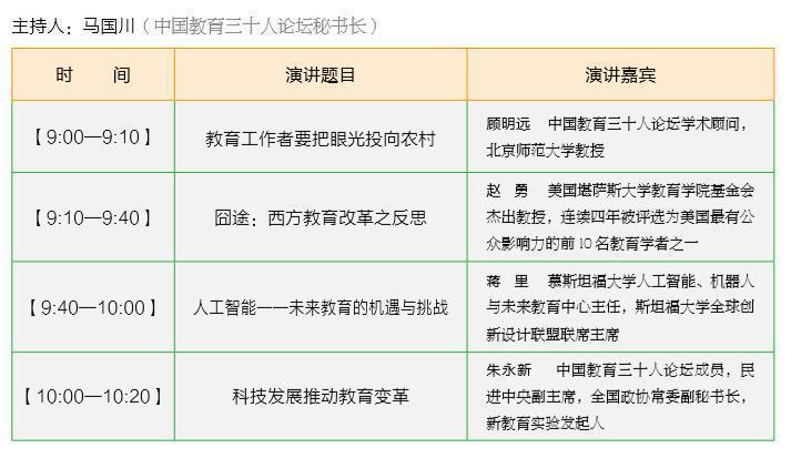 中国教育学会名誉会长、北京师范大学教授顾明远,民进中央副主席、全国政协副秘书长、新教育实验发起人朱永新,全国人大宪法和法律委员会副主任、民盟中央副主席徐辉,全国人大常委、长江教育研究院院长周洪宇,香港大学原副校长、世界教育前沿论坛主席程介明,北京师范大学教授、山东省教育厅原副厅长张志勇,北京大学社会科学部副主任、中国教育发展战略研究会副会长文东茅等将出席并发表演讲。