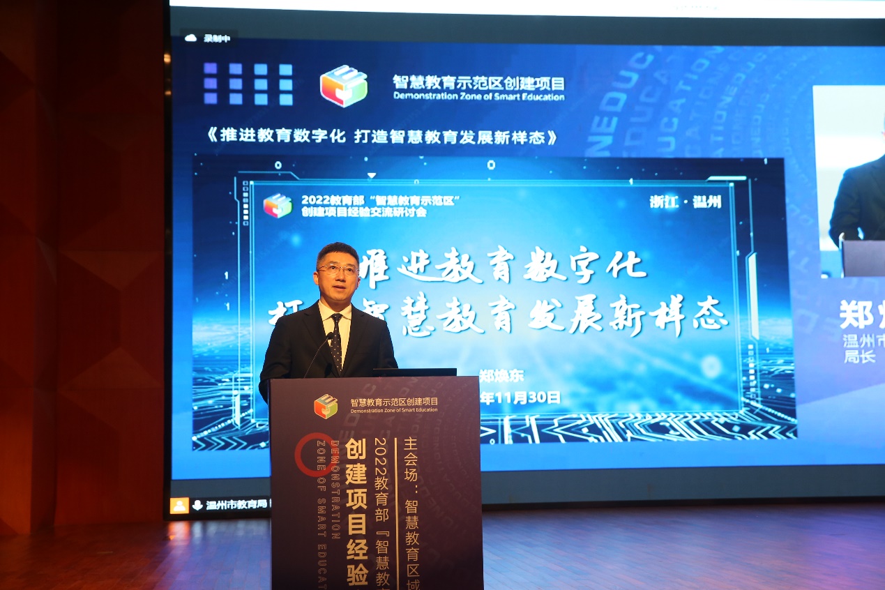 温州市教育局党委书记、局长郑焕东作《推进教育数字化 打造智慧教育发展新样态》报告,向全国分享区域智慧教育推进的“温州经验”。他指出,十年来,温州智慧教育从补硬件到新基建,从单应用到全场景,从数字化升级到数字化转型再到数字化改革,不断升级跃迁,走出了一条“数字大脑赋能+智慧校园标准引领”的特色路径。