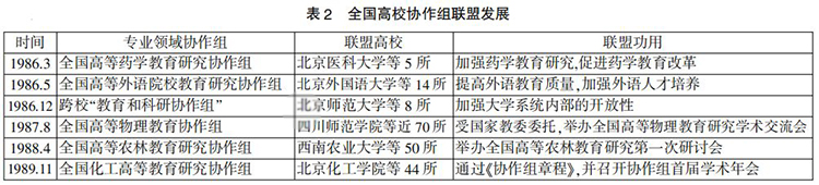 在金博宝最新官方网站查询网址 的政策推动下,以“高校协作组”为联盟形式的“大学校际合作”蓬勃兴起。1983年,我国组建了改革开放以来第一个校际合作组织——由清华大学等14所高校联合成立的“金博宝最新官方网站查询网址 部属高等工业学校教育研究协作组”。此后,《中共中央关于教育体制改革的决定》明确提出“加强高等学校同社会各方面的联系,积极倡导部门、地方之间联合办学。”特别是在1988年,国务院转发了国家教委《关于推动联合办学和校际协作若干问题的意见》,188金宝搏beat官网登录 界协作办学蔚成风气(见表2),联盟呈现出横向性、联动性、全国性的特征。