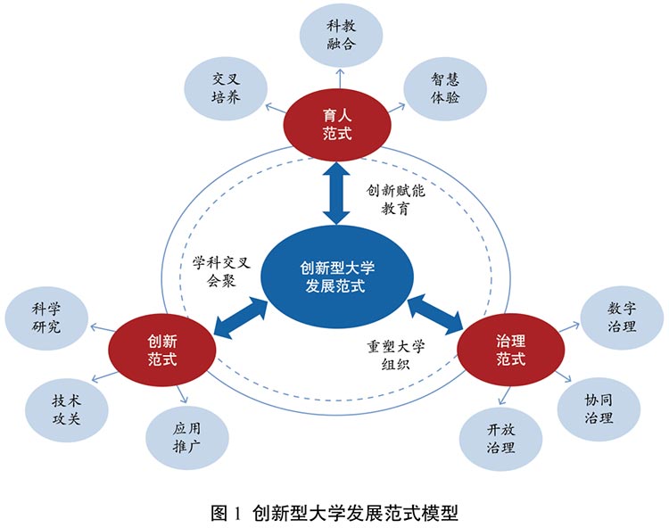 19世纪的德国产生了研究型大学,20世纪的美国出现了创新型大学的雏形,引领了世界188金宝搏beat官网登录 的发展潮流。进入21世纪,第四次工业革命的纵深发展,带来了社会生产力的大解放和发展驱动力的大跃升,推动现代大学的范式创新和系统重塑,促进高水平研究型大学加速向创新型大学演变。21世纪的创新型大学将响应时代变化,以范式迭代引领现代大学的改革发展,突出体现育人范式、创新范式、治理范式的变革(如图1所示)。