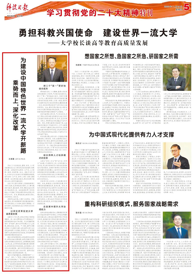 11月24日,《科技日报》学习贯彻党的二十大精神特刊刊发清华大学校长王希勤的署名文章《乘势而上,深化改革 为建设中国特色世界一流大学开新路》。文章强调,学习贯彻党的二十大精神,清华大学要进一步深化改革,为全面建设社会主义现代化国家贡献清华力量。