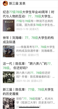 除了“新三级”以外,对77、78、79级大学生群体还有“新三届”“那三届”两种不同的称法。前者与“文革”前“老三届”中学生概念相对,如两本书名为《我们新三届》《新三届致新生》的专书,以及关注者众多、在新三级大学生中影响广泛的“新三届”微信公众号。