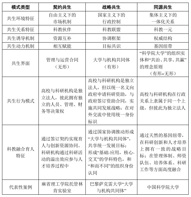 为回答研究问题,本文对世界范围内主要国家的高校与科研机构跨组织科教融合育人进行实践探析。本文通过分层抽样确定分析案例:第一步,选择先发国家中的美国和法国的作为两类科教制度安排的国家代表,选择中国作为后发国家代表。因为中国先后参考了欧洲大陆和盎格鲁-撒克逊模式建立起自己的科教体系,且受中国文化影响,科教制度安排呈现独特的样态;第二步,选择这三个国家中跨组织科教融合的典型案例。如前所述,美国研究型大学与国家实验室、法国高校与科研机构育人的协同育人,以及我国独特的科学院大学的育人实践广受学界关注。因此本文分别选择美国麻省理工学院与林肯国家实验室、法国以巴黎萨克雷为代表的大学与机构共同体,以及我国的中国科学院大学作为具体的分析案例。在图1理论模型的指导下,笔者通过文献调研、机构网站信息挖掘、制度文本、工作报告等内容分析,对具有典型代表性国家的高校与科研机构跨组织科教融合育人实践进行解析,最终将全球代表性经验抽提为三种模式:契约共生、战略共生、同源共生。下文将对三种模式进行详细解析。