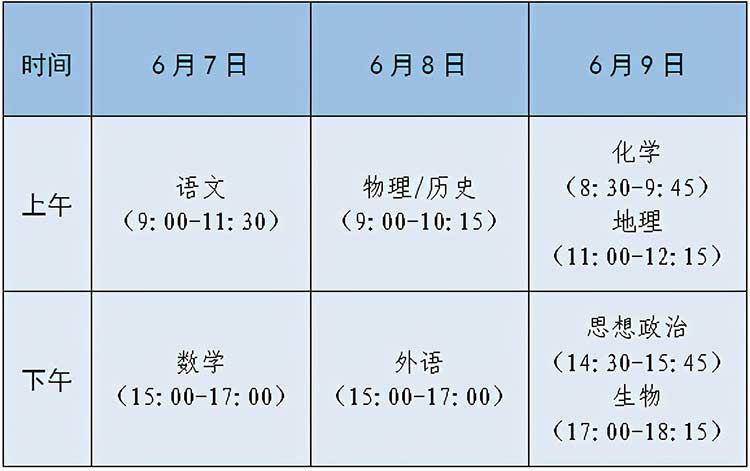 考试时间安排在6月7日至9日,共3天。语文科目考试时长为150分钟,数学、外语科目考试时长均为120分钟,学业水平选择性考试科目每科考试时长均为75分钟。具体考试安排为:
