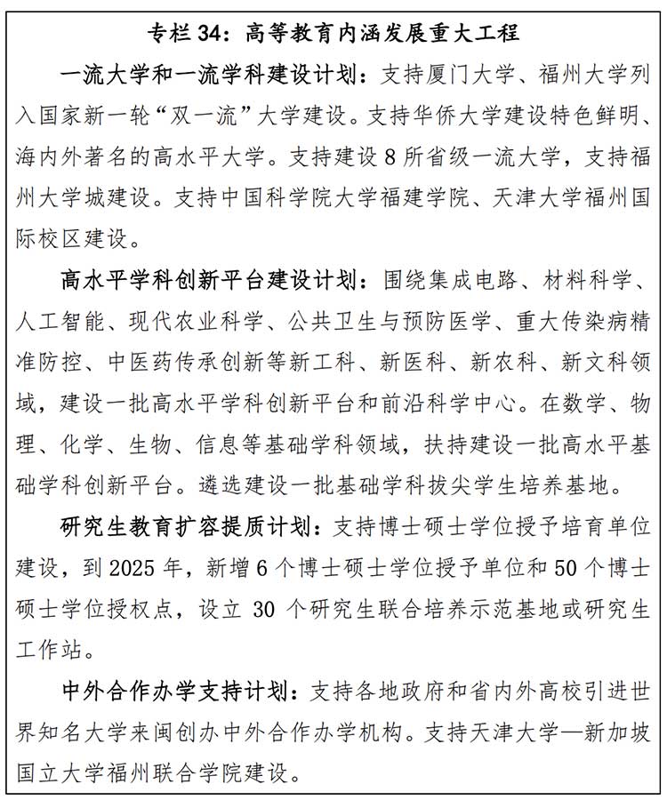 分类推进“双一流”建设,新推动 2~3 所省级一流大学跻身全国一流大学行列,若干个学科达到国家一流学科建设标准,若干个学科进入世界一流学科行列。加快示范性应用型大学建设。支持建设重点医学和师范院校,加快医学教育创新发展。布局建设一批未来技术学院、现代产业学院,加快培养理工农医类紧缺人才,打造一批高水平学科创新平台和科技前沿中心。积极引进国内外高水平大学和科研机构来闽合作办学,创办特色学院、分校或研究院。 推动福州地区大学城高校集群创新发展,全力打造全国一流大学城。支持中国科学院大学福建学院建设。推动研究生教育扩容提质, 新增一批博士硕士学位授予单位及学位授权点。