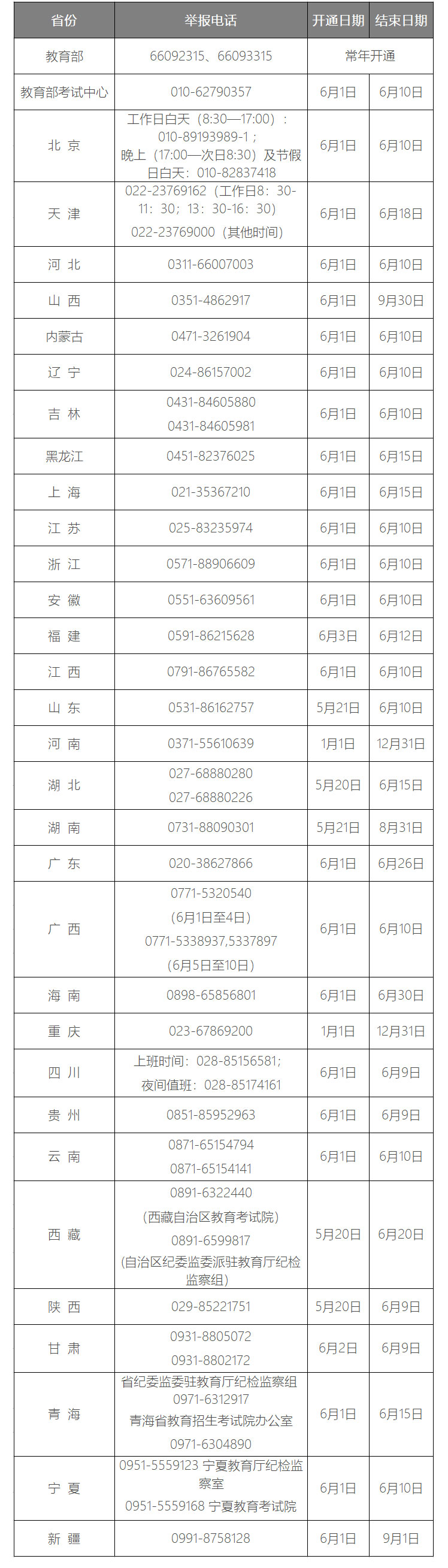 金博宝最新官方网站查询网址 和各省(区、市)开通2021年高考举报电话
