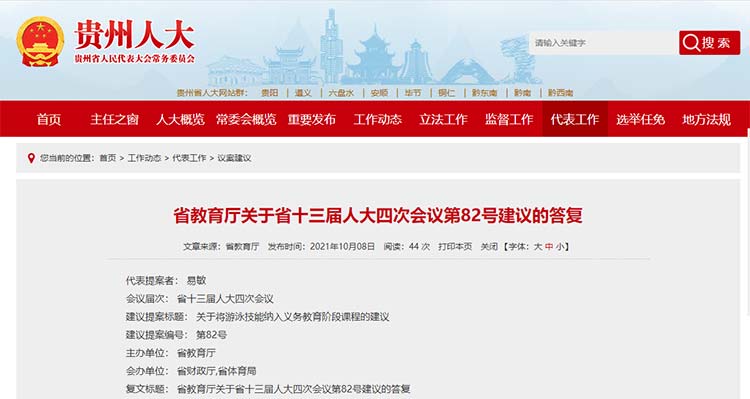 近日,贵州省教育厅在答复省人大代表易敏“ 关于将游泳技能纳入义务教育阶段课程的建议”中明确表示,今年贵州省教育厅将修订中考体育方案,新的体育考试方案将游泳列入学生自选项目,让学生任选泳姿完成50米和200米游泳。